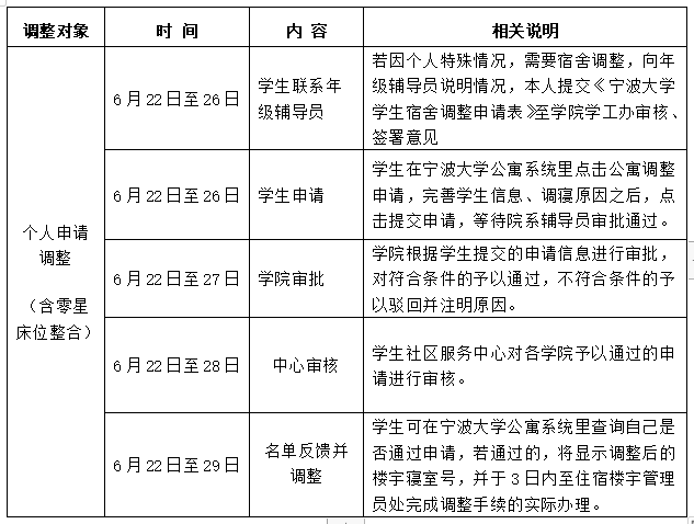 为了认真做好我校2022年寝室调整工作,根据《杏吧原创 学生宿舍管理办法》(宁大政字〔2007〕104号)和《学生社区宿舍调配、调整管理办法》,为使寝室管理规范化、常态化,现将本学年末寝室调整相关安排通知如下,原则上学年中不受理。