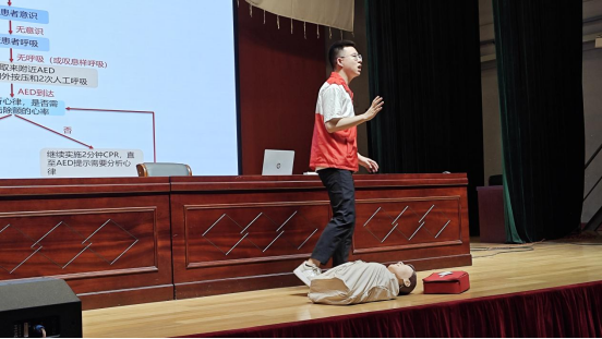江北区红十字应急救护师黄務磊老师用生动鲜活的实例与通俗易懂的语言,详细介绍了心搏骤停及生存链、心肺复苏(CPR)知识、自动体外除颤器(AED)的操作步骤这三方面内容。黄老师还在现场借用救援人模型就心肺复苏涉及的迅速呼救、胸外按压、开放气道、人工呼吸和AED使用等操作步骤进行了分解演示。在场同学们聚精会神、认真倾听,对应急救护的重要性以及相关知识有了初步了解。