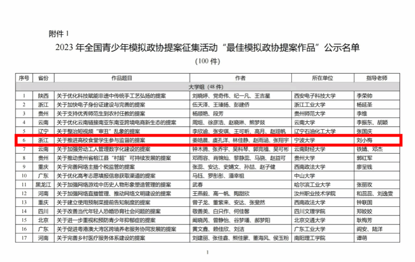学子负责撰写的《关于推进高校食堂学生参与监督的提案》成功入选“最佳模拟政协提案作品”。