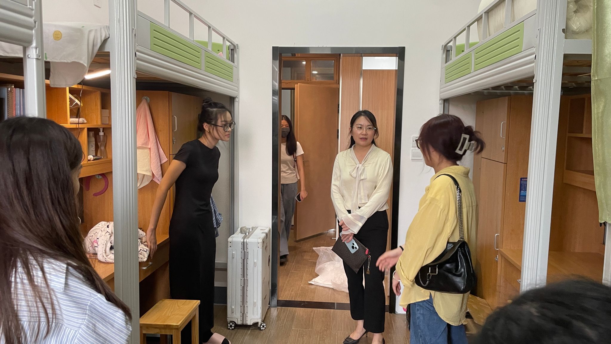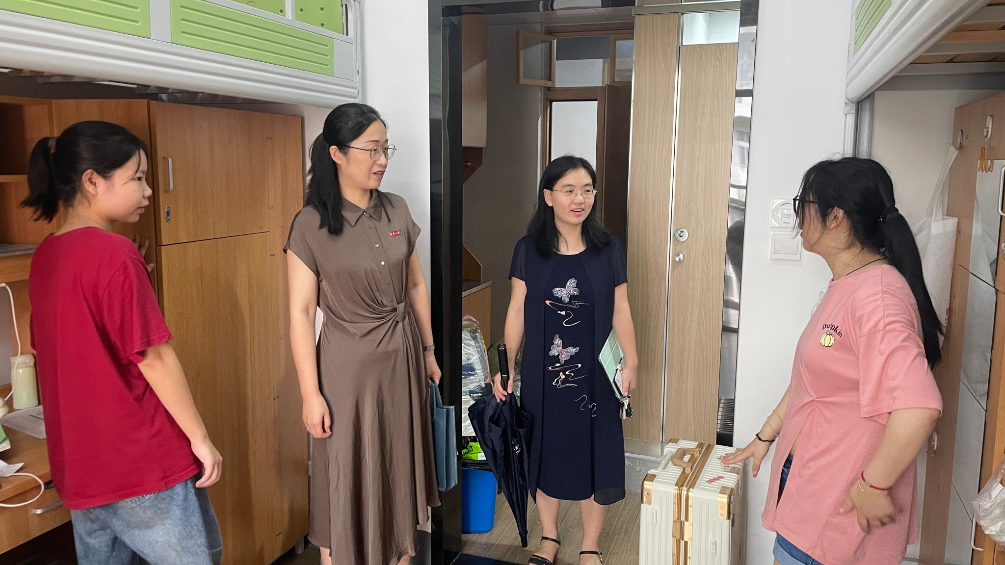11日,学院党委书记孙芬娜、副院长何跃军、副书记谢果凰、副院长王婉娟在辅导员的陪同下,走访了研究生新生寝室,关心新生入住情况,与新生和家长们进行了深入交流。