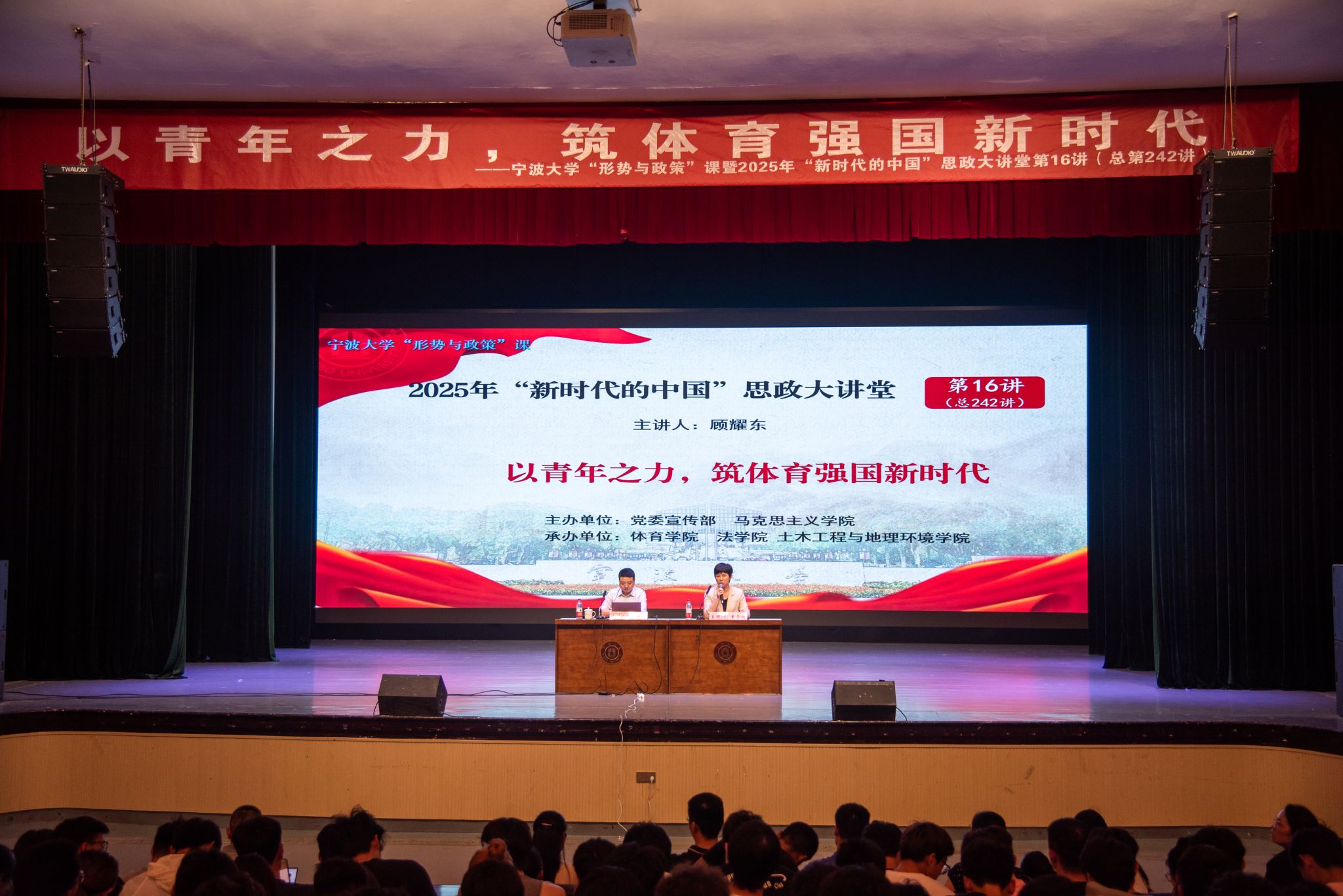 、体育学院、土木工程与地理环境学院的800余名师生主讲题为《以青年之力,筑体育强国新时代》的“形势与政策”课。讲座由体育学院党委书记童莹娟主持。
