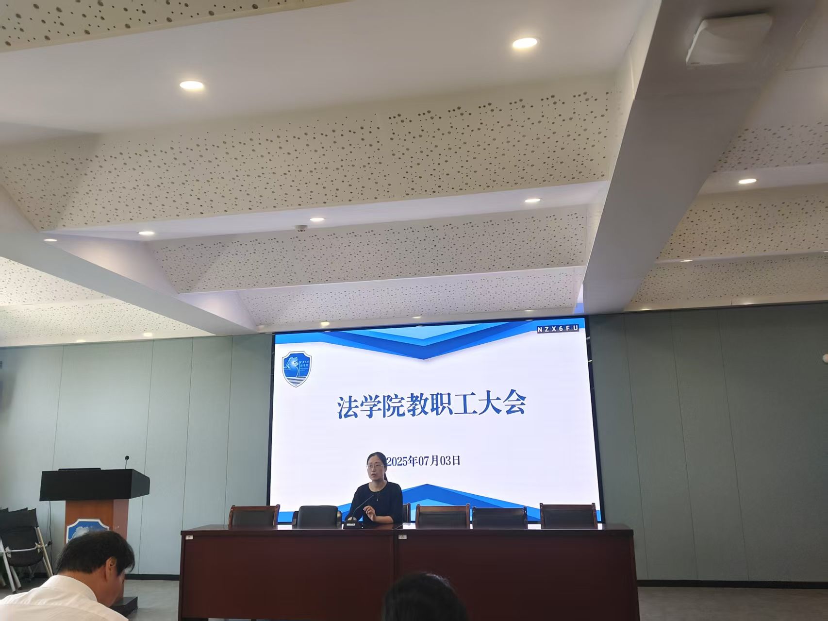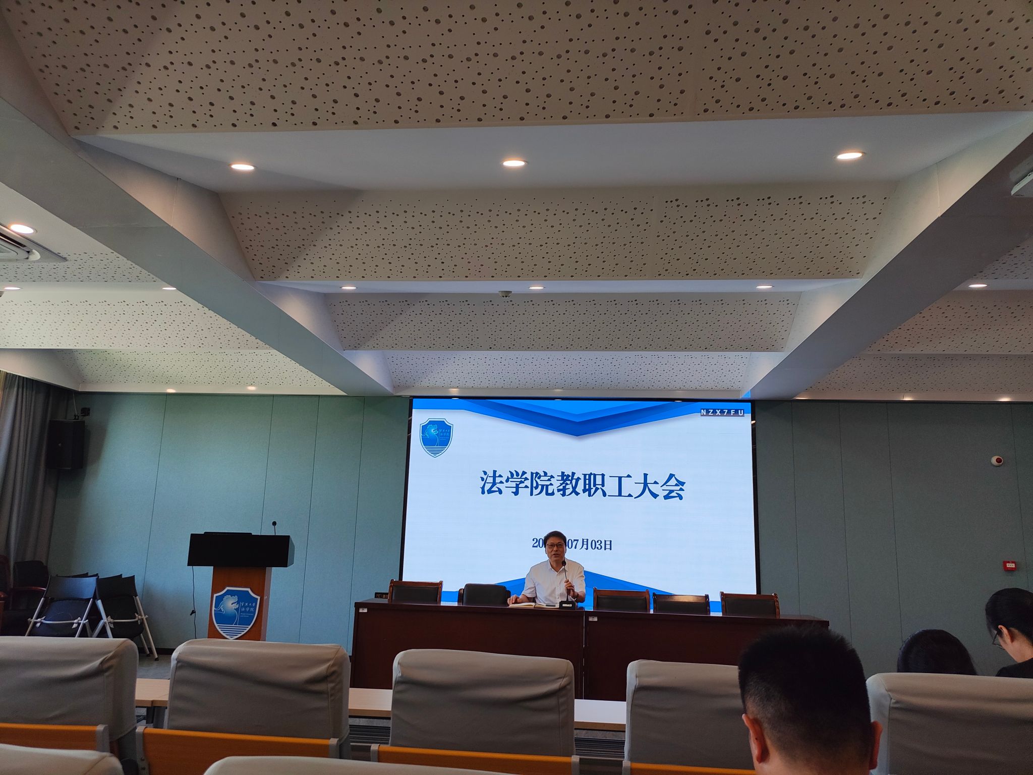 在学院217报告厅召开全体教职工大会。会议由学院党委书记孙芬娜主持,学院班子成员、全体教职工参会。