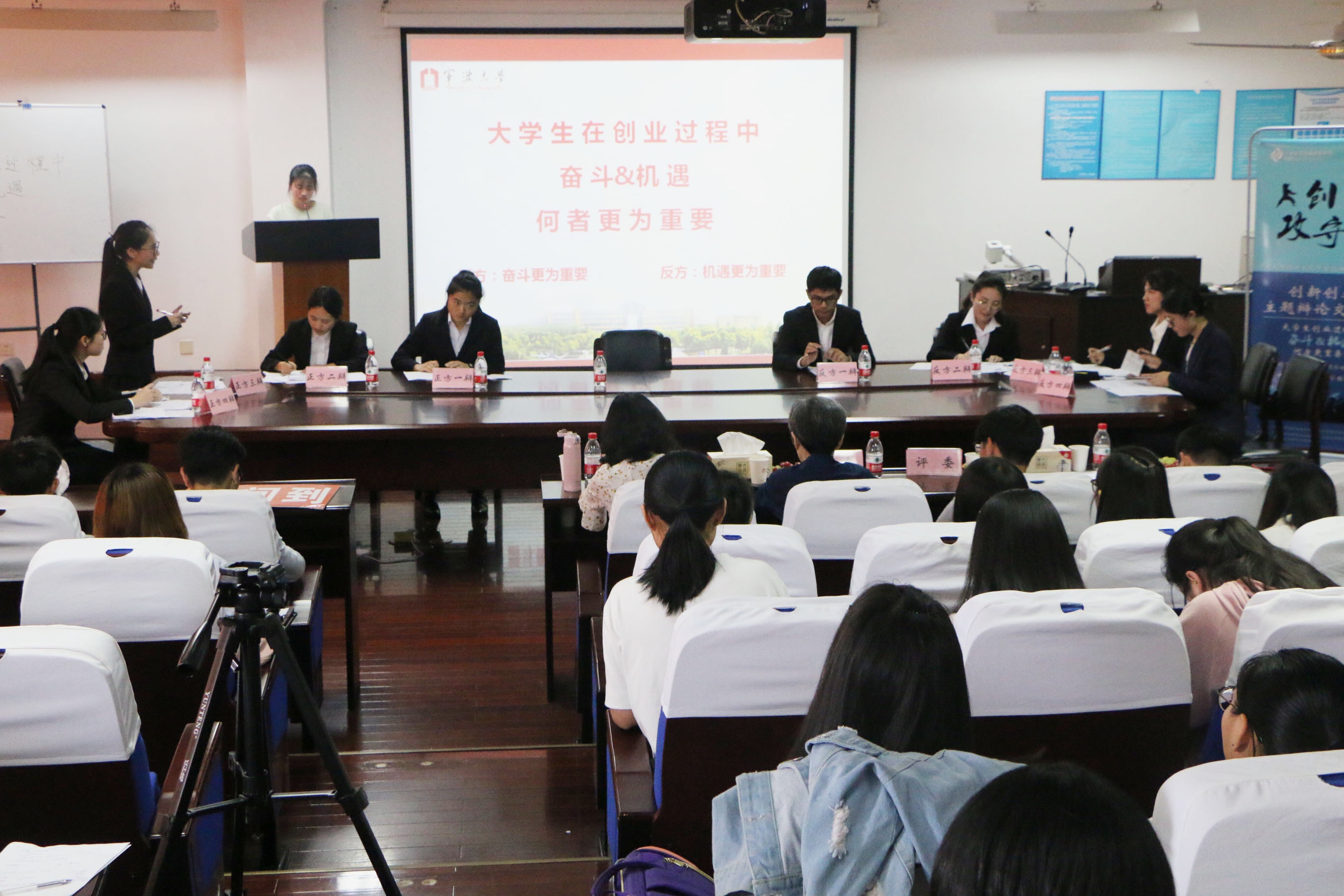 217报告厅成功举办。活动以创新创业主题辩论交流赛形式举行,共有八名选手参赛,活动辩题为“大学生创业过程中奋斗和机遇何者更为重要”。