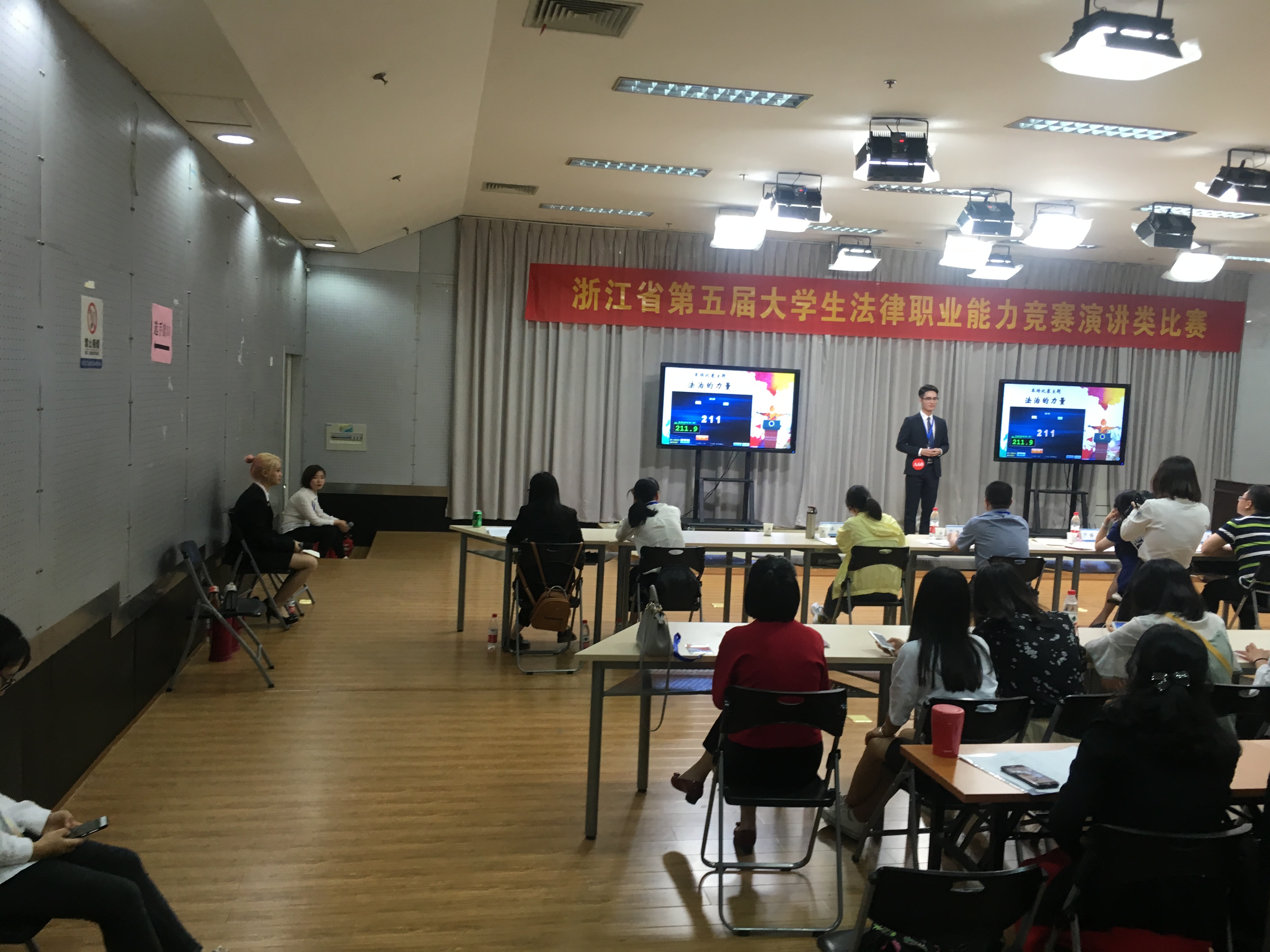 决赛分A、B两组同时进行,每位选手提前30分钟抽取题目,随后发表4分钟即兴演讲。围绕“法治浙江建设的路径”、“法治的力量”、“法律职业的信仰”等主题,我校11名选手灵活运用专业知识和生动案例侃侃而谈,充分展现出我校学生扎实的专业素养和良好的精神风貌。