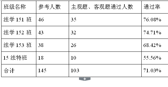 近日,2018年度法律职业资格考试成绩揭晓。2015级法学专业学生总数171人,参考人数145人,参考率84.79%;通过人数103人,通过率71.03%。客观题最高分239分(满分300分),主观题最高分136分(满分180分)。其中法学151班有35位同学通过,通过率76.08%;法学152班有32位同学通过,通过率74.71%.