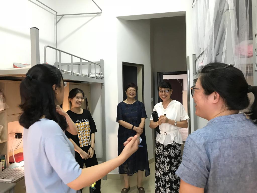 8月28日下午,院长钭晓东老师,党委书记李学兰老师,副院长龚虹波老师、何跃军老师,党委副书记孙芬娜老师,学工办主任吴敏老师,以及辅导员刘小梅、杨琦一行到甬研公寓走访慰问2019级研究生新生。