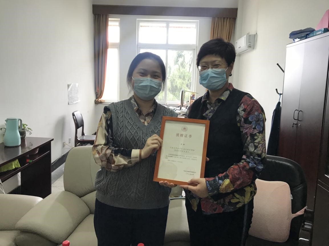 党委书记李学兰、副书记孙芬娜代表学院接收了防疫物资,并颁发了捐赠纪念证书。