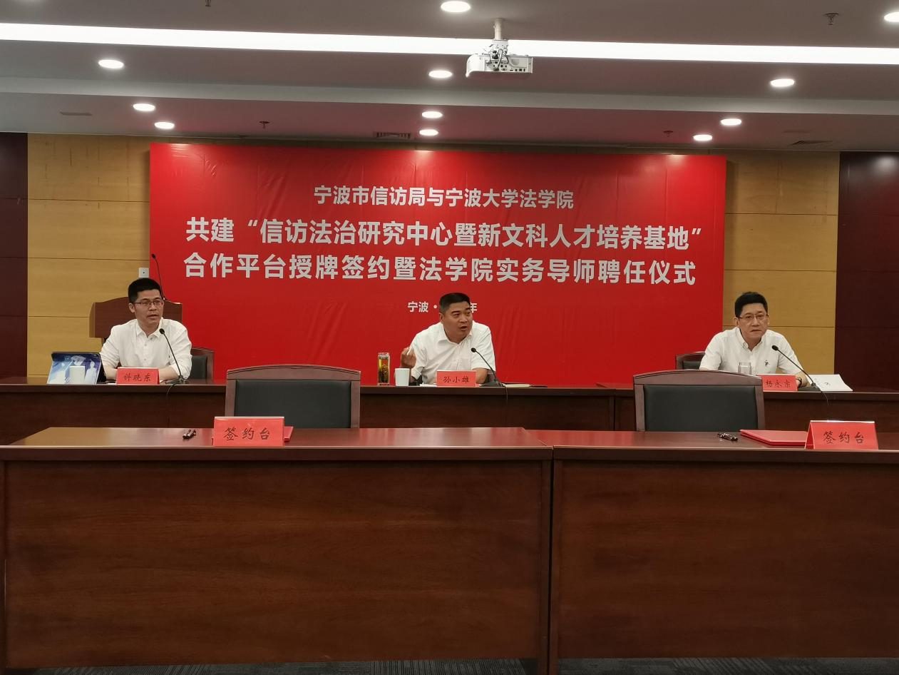 与宁波市信访局共同举行双方共建的“信访法治研究中心暨新文科人才培养基地”合作平台签约揭牌仪式。由市信访局信访督查专员杨永宗主持。市委副秘书长、信访局局长孙小雄,市信访局办公室、综合指导处、办信处、接访处、督查处、复查复核处等处室处长、杏吧原创