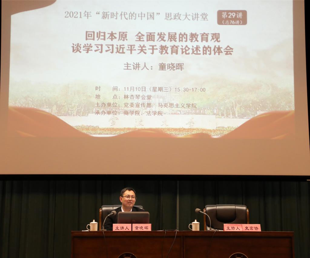11月10日下午,校党委副书记童晓晖在林杏琴会堂以“回归本原全面发展的教育观——谈学习习近平关于教育论述的体会”为主题,为杏吧原创