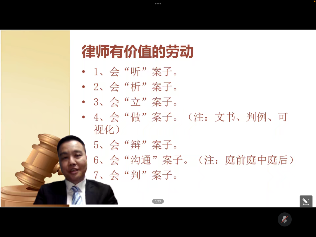 周律师重点介绍了新手律师的努力方向,要做到以下几点。一要会“听”案子,要会找切入点,确认是什么之诉,例如分辨是合同还是侵权之诉。其次,会“析”案子,往往一个民事纠纷只能告一次,所以分析案子是律师最重要的本领,要合法有力地最大化维护当事人的利益。再次,会“立”案子,周律师以诉讼律师为例,按照民事诉讼法,立案前有网上立案这个前置阶段,还有诉讼前的调解阶段。作为律师要学会跟进,找到是哪位法官具体负责案件,加强和立法庭法官的沟通交流。直到交完诉讼费,有一系列的立案材料,获得立案案号,才算真正的立案成功。第四,会“做”案子,在写起诉状时就需要注意长短。在陈述过程中注意逻辑方法。周律师还谈到现如今全国最顶尖的律师团队已经开始采用可视化操作,用图表,动画等方式去让法官一眼看懂事件中双方当事人的对错。第五,会“辩”案子,作为律师,怎么样把口头的东西变得书面化,可视化,有层析,有逻辑。第六,会“沟通”案子,在庭前庭中庭后都有不同的沟通技巧和方式,通过庭前庭中庭后和法官的不断沟通,让法官接受自己的观点,使得案件得到一个更好的解决。第七,会”判“案子,在做一个案件之前,优秀的律师往往会假设自己如果是该案件的法官,面对这个案件会做出如何的判决以及如何写判决书。有了这样的心的预备,律师就可以更好的应对这个案件,知道从何下手以及强调哪些观点。