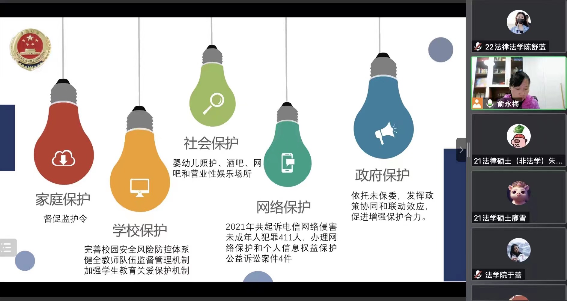 本次线上讲座圆满结束,俞主任向大家表达了“孩子们成长得更好,是我们最大的心愿”的真切愿望,并对所有参会成员表示感谢。整场讲座内容丰富,为在场师生带来了一场精彩的学术盛宴,引发了大家度对未成年人制度的充分讨论与思考。