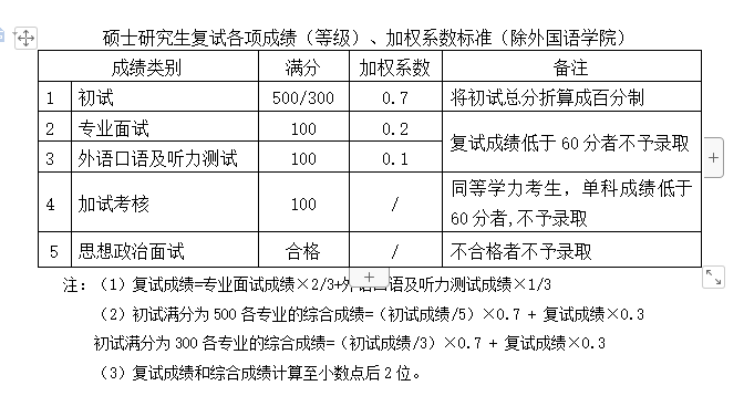 8.复试当日面试人员和工作人员,须提前30分钟到达复试地点,做好复试准备,同一学科(专业)各复试小组的面试成绩评定标准应统一。复试成绩实行百分制。复试各项成绩评定、计算根据学校统一划定的标准执行。(见下表)