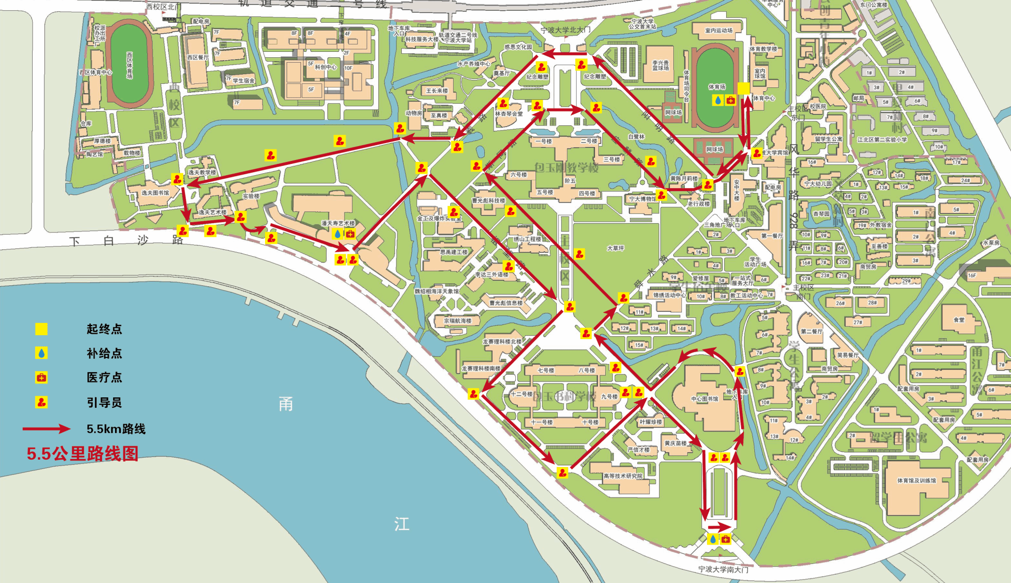 5.5公里路线说明:本部田径场-安中大楼-阳明路-北大门-宗羲路-经纬路-逸夫艺术楼-潘天寿艺术楼-祖望路-包玉书科学楼-中心图书馆-大草坪-绣山工程楼-曹光彪科技楼-斯同路-一号楼、二号楼-应麟路-黄陈月莉楼-本部田径场