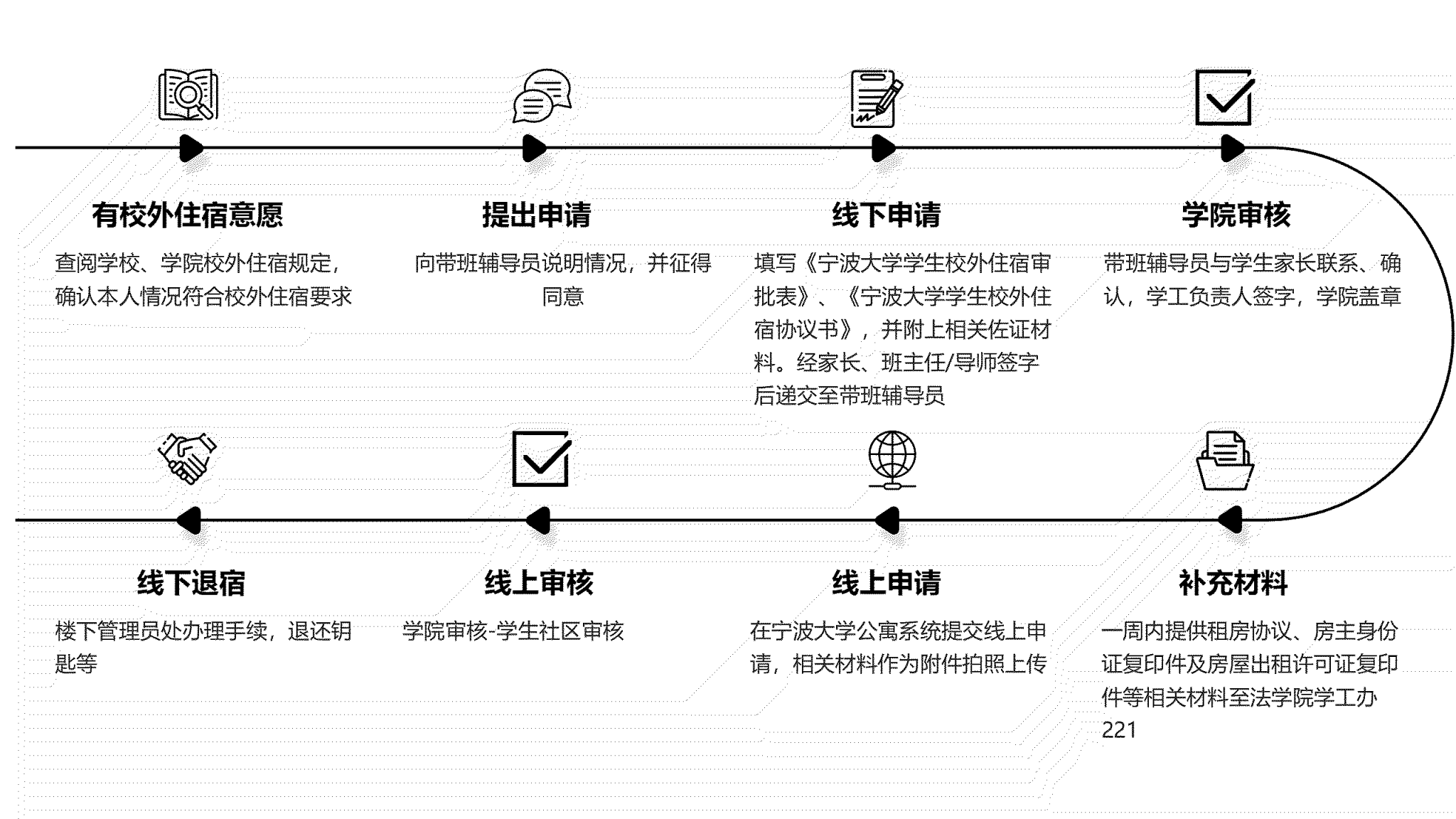 (四)学生未办理校外住宿申请手续擅自在校外住宿引起的责任后果由学生本人自负,一经发现,根据《宁波大学学生违纪处分办法》进行严肃处理。