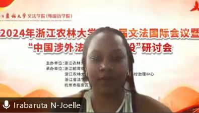 7月31日,法学院来自布隆迪的2023级留学硕士研究生Irabaruta Nadia-Joelle应邀参加了浙江农林大学文法学院(外国语学院)主办的2024年浙江农林大学第二届文法国际会议暨 “中国涉外法治体系建设”研讨会,与来自美国、新加坡、德国、波斯尼亚和黑塞哥维那等国以及国内清华大学、中国人民大学、浙江大学、中国政法大学、沈阳师范大学、湖南大学、辽宁大学、山西大学等共计20余家高校的90余名法学专家学者和学生展开学术探讨与交流。