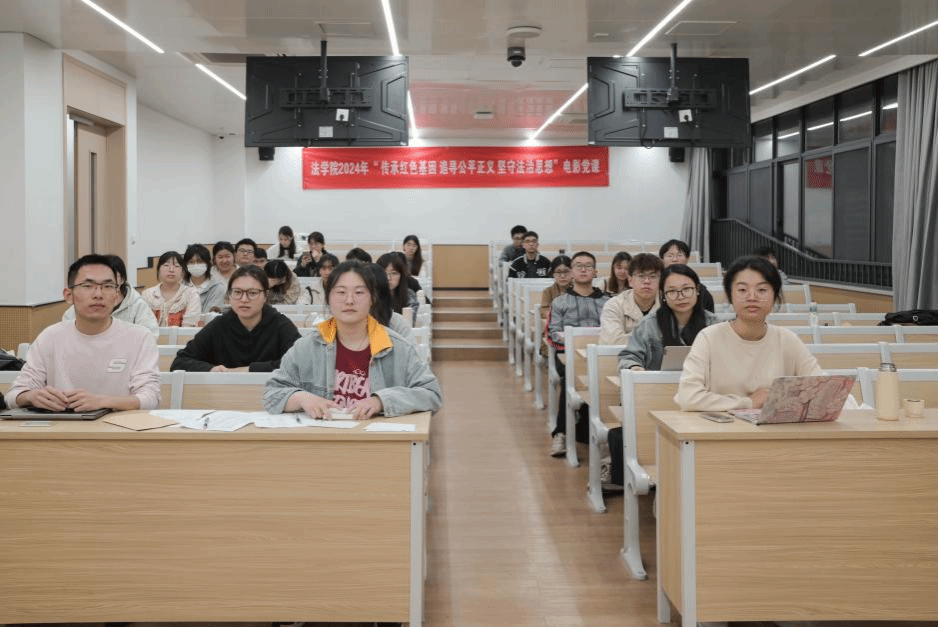 为提升青年学生党性修养,增强法治意识,激励使命担当, 2024年5月12日晚,法学院分党校组织全体学员开展以“传承红色基因,追寻公平正义,坚守法治思想”为主题的电影党课,集体观影法治电影《第二十条》。