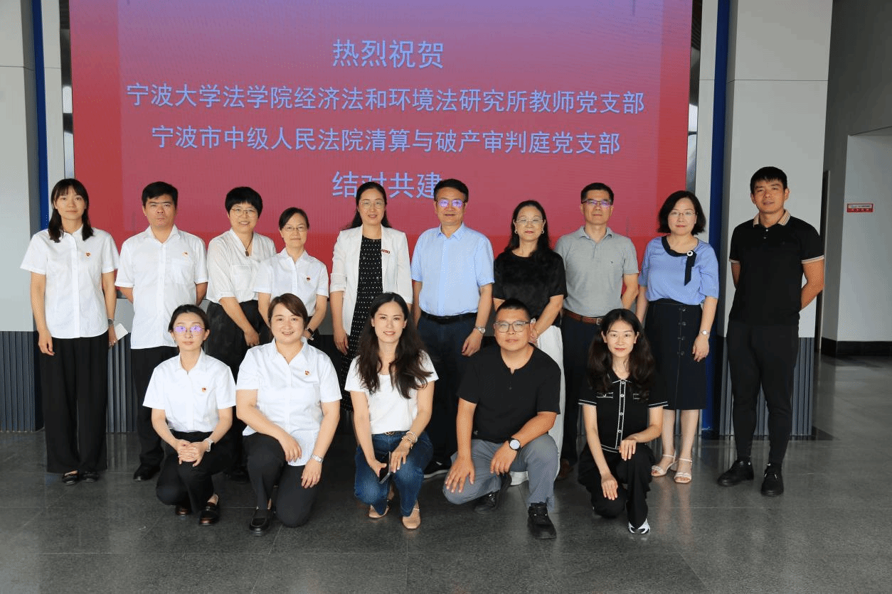 2025年9月10日下午,宁波大学法学院经济法和环境法研究所教师党支部与宁波市中级人民法院清算与破产审判庭党支部在宁大法学院举行结对共建仪式。宁波大学法学院党委书记孙芬娜、法律系副主任郭靖祎、党支部书记郑曙光以及宁波中院清破庭党支部书记莫爱萍出席会议,两个支部全体党员参会。