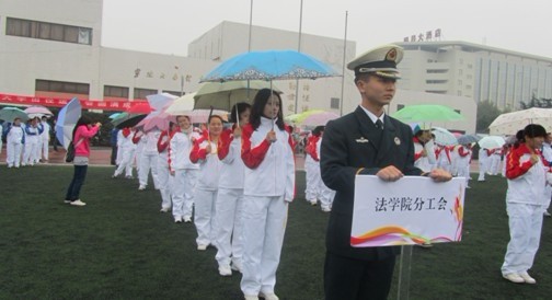 2011年11月10日,一年一度的教职工趣味运动会又拉开了帷幕。今年的运动会增加了全校教职工的工间操展演。经过平时的练习和9日的预演,法学院20人组成的代表队由学院党委方晓春书记带队,身着统一的运动服精神抖擞地亮相。尽管天公不作美,一直淅淅沥沥地下着小雨,但一点也没有影响大家的情绪,仍然兴高采烈地参加了展演。
