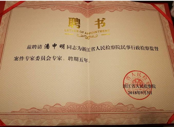 我院潘申明教授受聘浙江省人民检察院民事行政检察监督案件专家委员会专家顾问,聘期五年。