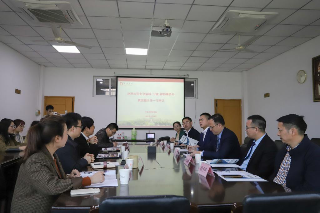 为加强校企合作,切实提高法学院学子的实务能力,2021年4月16日上午,北京盈科(宁波)律师事务所执行主任黄国超、管委会副主任黄克游、周云卿、高级合伙人徐平华、周洪浪、合伙人钟彩琼一行走进宁波大学法学院参观交流,宁波大学法学院党委书记李学兰、副院长何跃军、法律系副主任汤晓锋、JM中心副主任张文松、研究生办主任于蕾、图书馆信息中心杜晓毅进行了热情接待并陪同。