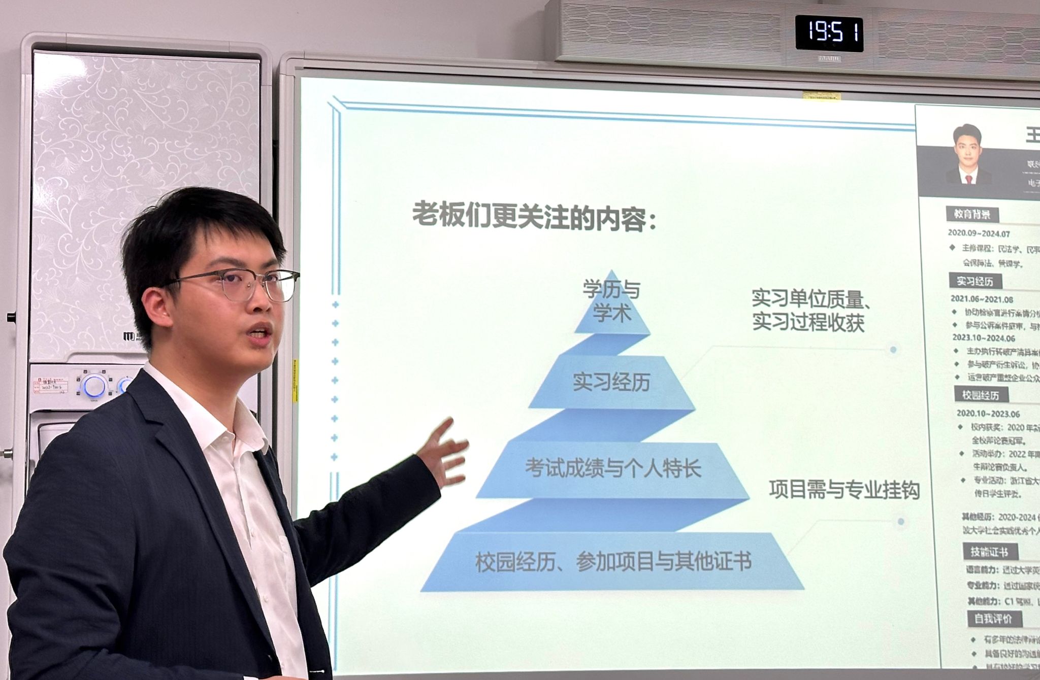王毅学长首先指出宁波大学法学院在地理条件和师资力量方面具有的优势。接着,他向同学们介绍了法学专业学生毕业后的热门就业单位,讲解各单位之间的差异性,同时进行利弊探讨,引导同学们认清就业现状和改变以往偏见。他在指导过程中多次强调实习实践的重要性,不仅有利于将理论知识转化为实践操作,还为未来参加工作奠定了坚实的基础。最后,王毅学长向在场同学讲解了简历的书写要点、排版要求以及内容优化方法,同学们纷纷表示受益匪浅。