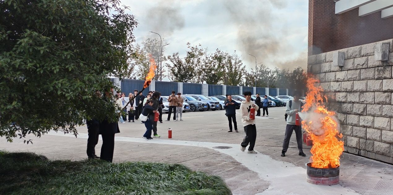 第三阶段为:灭火实操演练。在法学院楼前空地,消防办工作人员现场讲解了干粉灭火器、消防栓等常用消防器材的使用方法,并指导师生进行实际操作。法学院教工代表和学生代表依次上前体验灭火过程,掌握了“提、拔、握、压”等基本操作要领。通过“真灭火、真动作”的实操训练,大家不仅提升了初期火灾处置能力,也增强了面对突发火情的自信心和应对力。