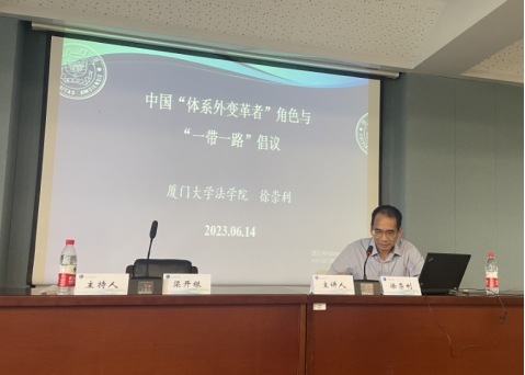 6月14日下午,中国“体系外变革者”角色与“一带一路”倡议主题讲座在法学院217顺利举办。本期讲座由厦门大学特聘教授徐崇利主讲,宁波大学法学院院长、教授梁开银主持。近百名师生聆听了本次讲座。