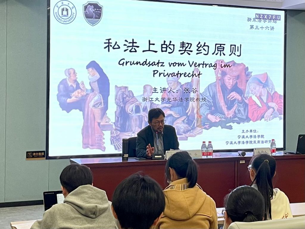 11月25日下午,浙东法学讲坛第三十六讲:“私法上的契约原则”在法学院217顺利举办。本期讲座由浙江大学光华法学院教授、博士生导师张谷主讲,宁波大学法学院教授刘满达老师主持。法学院百余名师生聆听了本次讲座。