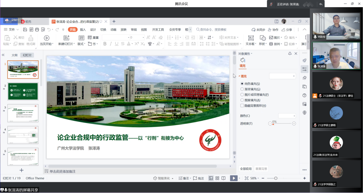 2022年4月11晚,宁大法苑讲坛第4讲“论企业合规中的行政监管”通过腾讯会议以线上方式顺利举行。广州大学法学院原院长、教育部法学教育指导委员会委员张泽涛教授担任主讲人,宁波大学法学院副院长何跃军教授担任主持人,法学院一百六十余名师生聆听了本次讲座。