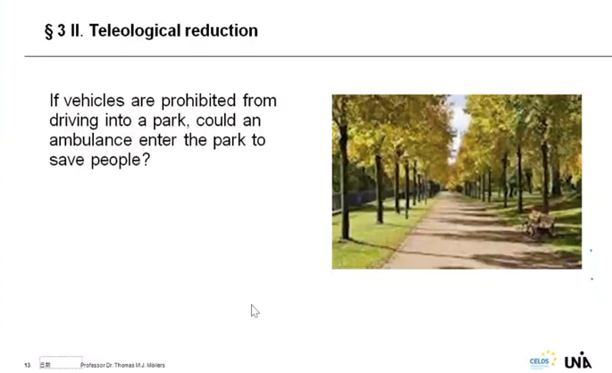 关于个案类比和法定解释,默勒斯教授以“如果禁止车辆驶入公园,救护车能否进入公园救人?”为例子,进行了目的论限缩的解释,我们有基本的规则即普通的汽车不得进入进入公园,但救护车是个例外,应该有进入公园帮助人们的权利,因为该规则的目的在这里并不适用。