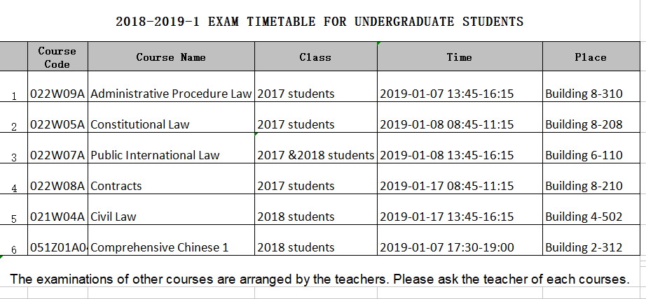 The examination time and place is shown in the table below, please pay attention! The examinations of other courses are arranged by the lecturer, and please confirm with lecturer.