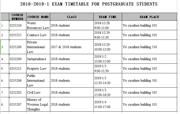 Here is the time table of the unified examinations. The examinations of other courses are arranged by the lecturer, and please confirm the examination time and place with the lecturer.
