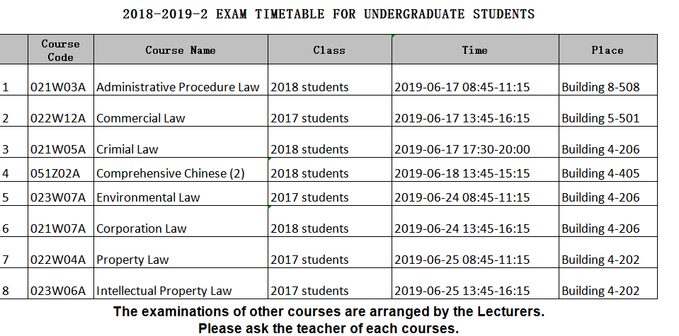 The examination time and place is shown in the table below, please pay attention! The examinations of other courses are arranged by the lecturer, and please confirm with lecturer.