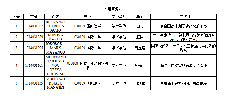 宁波大学2020届春季法学院留学生硕士学位论文答辩公告