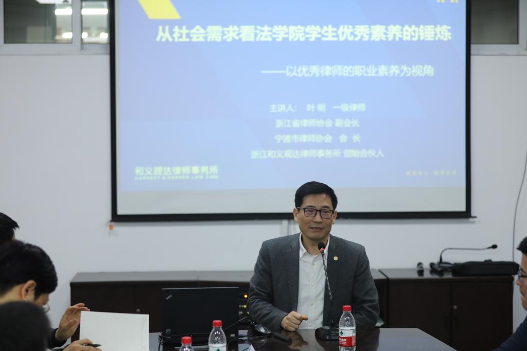 活动的第二阶段议题为“法学人才培养专题交流会”。叶明校友以学长的身份,就“从社会需求看法学院学生优秀素养的锤炼——以优秀律师的职业素养为视角”这一主题,与现场师生进行了深入分享。从法学院历届在甬工作的毕业生发展现状谈起,叶明学长抛出了一连串的问题,引发大家对社会到底需要什么样的人才这一问题的思考。在全面推进依法治国的大背景下,他认为法治社会需要术业有专攻的研究型法学专家人才、务实进取的应用型专业人才、领军型管理和专业人才。结合自身的职业发展和行业体验,他强调法学院在人才培养过程中,要注重对学生独立思辨能力、创新能力、高情商处事能力、写作能力、团队管理能力、信息化运用能力、外语英语能力七大能力的锤炼。最后,他寄语同学们“把法律人的优秀品质(创新、进取、专注、勤奋、忍耐、坚守、虚心、严谨等)当做你一种习惯,你便优秀;当你长期坚持,你便杰出!当你知行合一,都做到了,你便可成为明日之星!”。