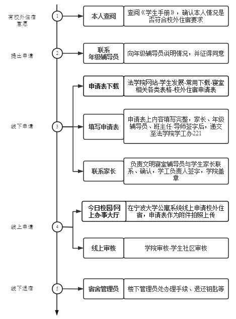 根据《宁波大学学生宿舍管理办法(宁大政[2017]104号)》规定,全日制普通教育本、专科学生以及研究生在校学习期间,原则上不得在校外住宿。年满18周岁的二年级以上(包括二年级)本、专科学生以及研究生因特殊情况确需在校外住宿的,应在每年5月15日至5月30日向所在学院提出下一学年的校外住宿申请。法学院申请和办理校外住宿手续程序如下: