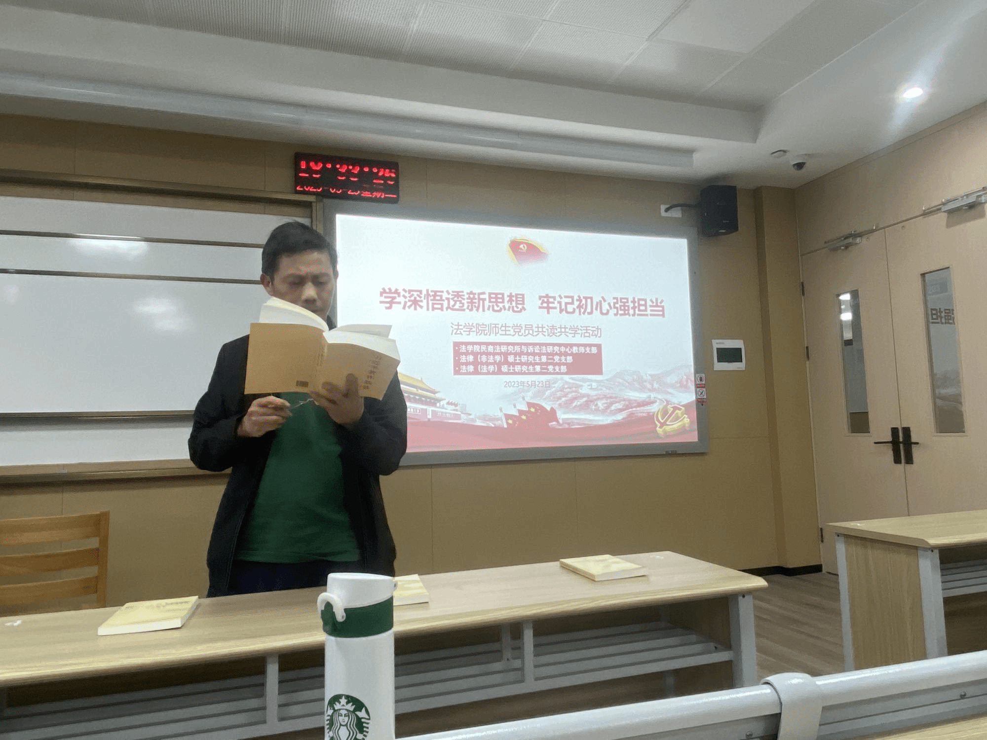5月23日晚,为深入开展学习贯彻习近平新时代中国特色社会主义思想主题教育,全面对标“学思想、强党性、重实践、建新功”总要求,法学院民商法研究所与诉讼法研究中心教师党支部联合法学院法律(法学)硕士研究生第二党支部、法律(非法学)硕士研究生第二党支部共同开展了“学思想 铸忠诚 强担当”师生党员共读共学活动,民商法研究所与诉讼法研究中心党支部书记刘满达老师以及师生党员代表20余人参加了此次活动。