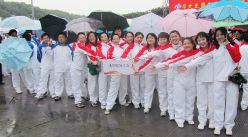 2011年11月10日,一年一度的教职工趣味运动会又拉开了帷幕。今年的运动会增加了全校教职工的工间操展演。经过平时的练习和9日的预演,法学院20人组成的代表队由学院党委方晓春书记带队,身着统一的运动服精神抖擞地亮相。尽管天公不作美,一直淅淅沥沥地下着小雨,但一点也没有影响大家的情绪,仍然兴高采烈地参加了展演。