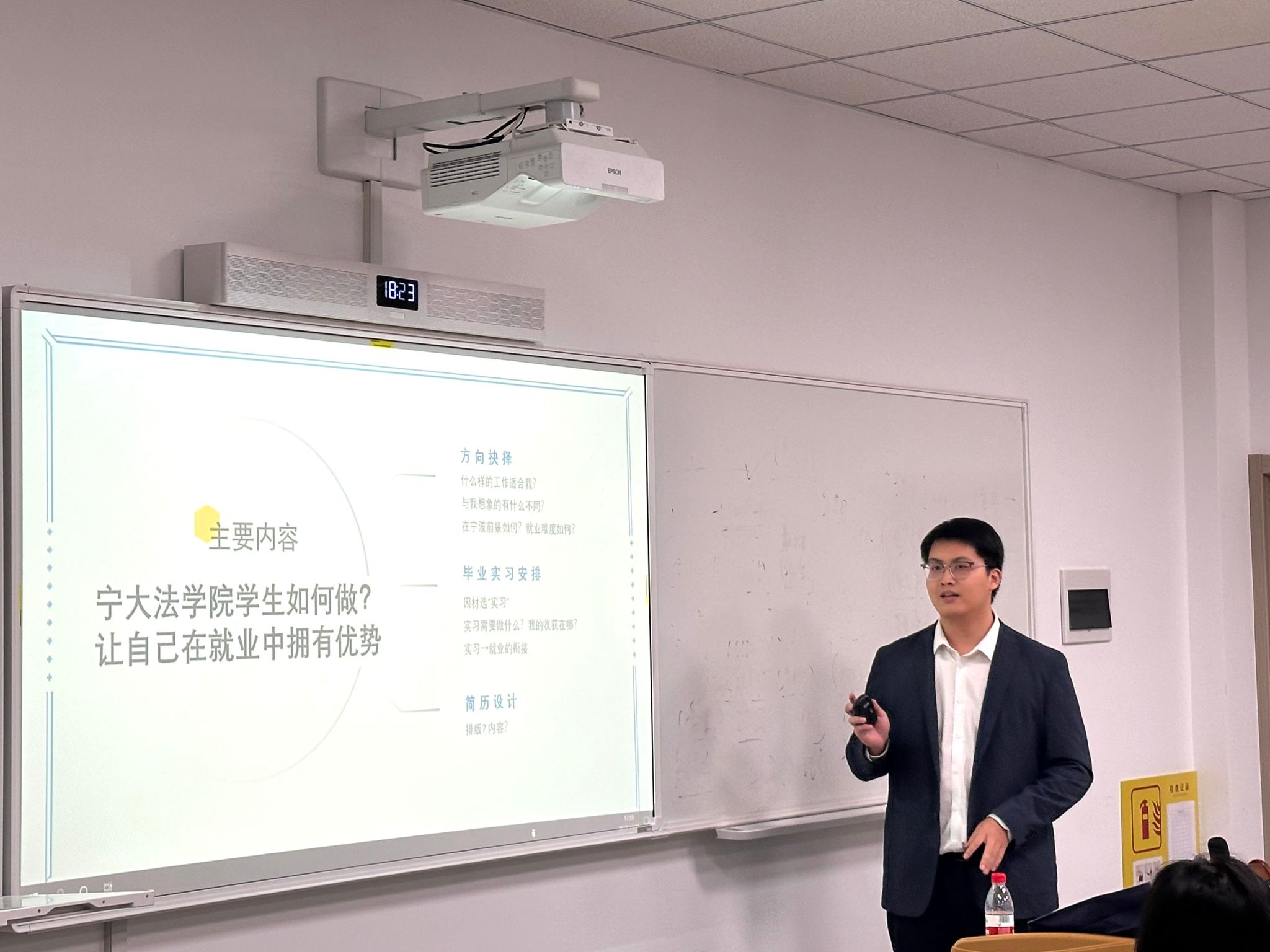 王毅学长首先指出宁波大学法学院在地理条件和师资力量方面具有的优势。接着,他向同学们介绍了法学专业学生毕业后的热门就业单位,讲解各单位之间的差异性,同时进行利弊探讨,引导同学们认清就业现状和改变以往偏见。他在指导过程中多次强调实习实践的重要性,不仅有利于将理论知识转化为实践操作,还为未来参加工作奠定了坚实的基础。最后,王毅学长向在场同学讲解了简历的书写要点、排版要求以及内容优化方法,同学们纷纷表示受益匪浅。