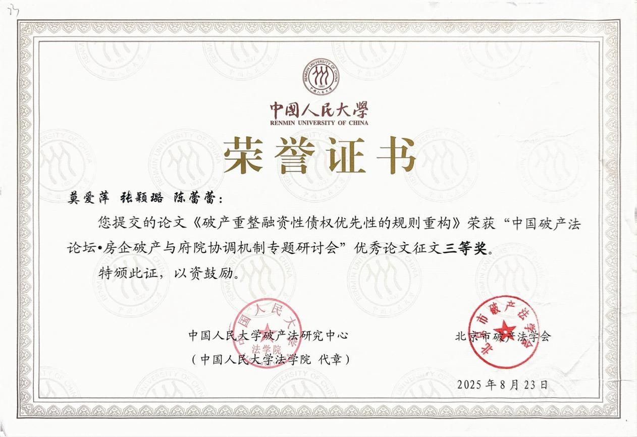法学硕士研究生陈蕾蕾与宁波中级人民法院破产庭庭长莫爱萍、镇海区人民法院专委张颖璐合作的论文《破产重整融资性债权优先性的规则重构》荣获三等奖。