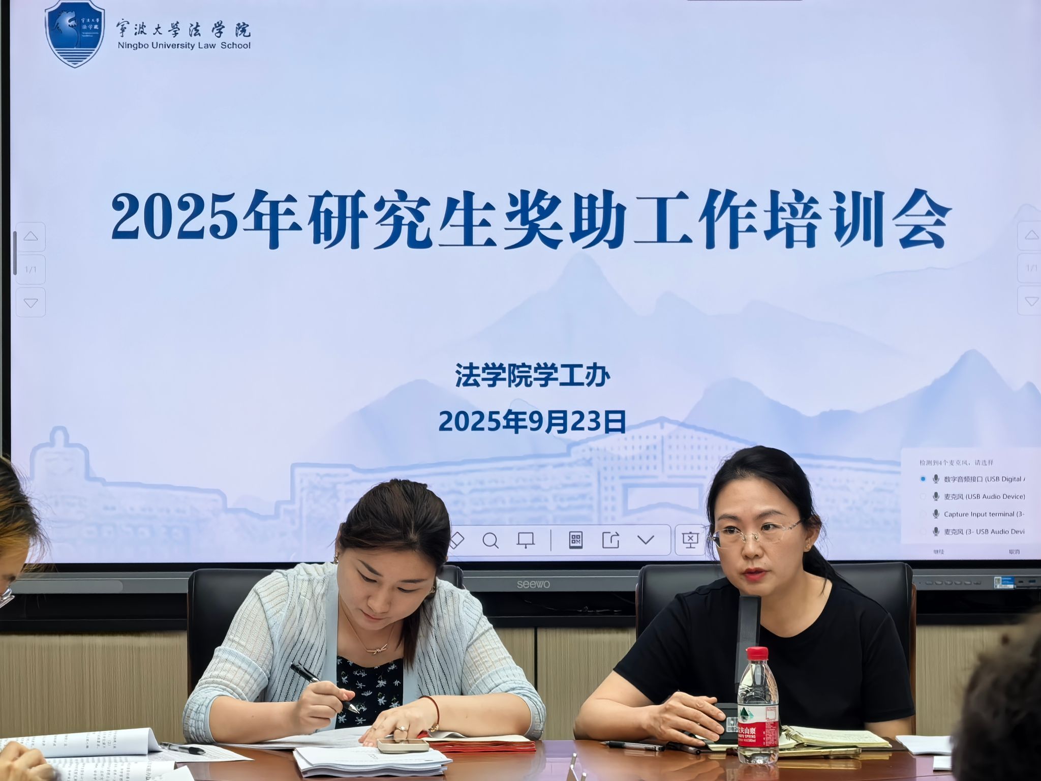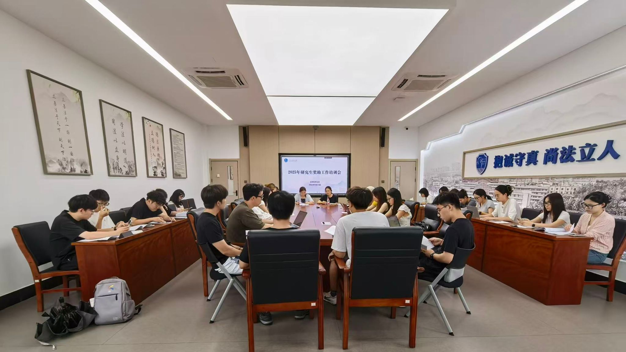 为确保研究生奖学金评定工作规范、有序推进,9月24日,法学院在202会议室组织召开研究生奖助工作培训会。会议由法学院党委副书记谢果凰、辅导员戴丽莉主讲,面向各研究生班级奖学金评定小组成员开展专题培训。会议围绕奖助政策核心要点,通过细则解读、案例分析与互动答疑,为后续评定工作奠定坚实基础。