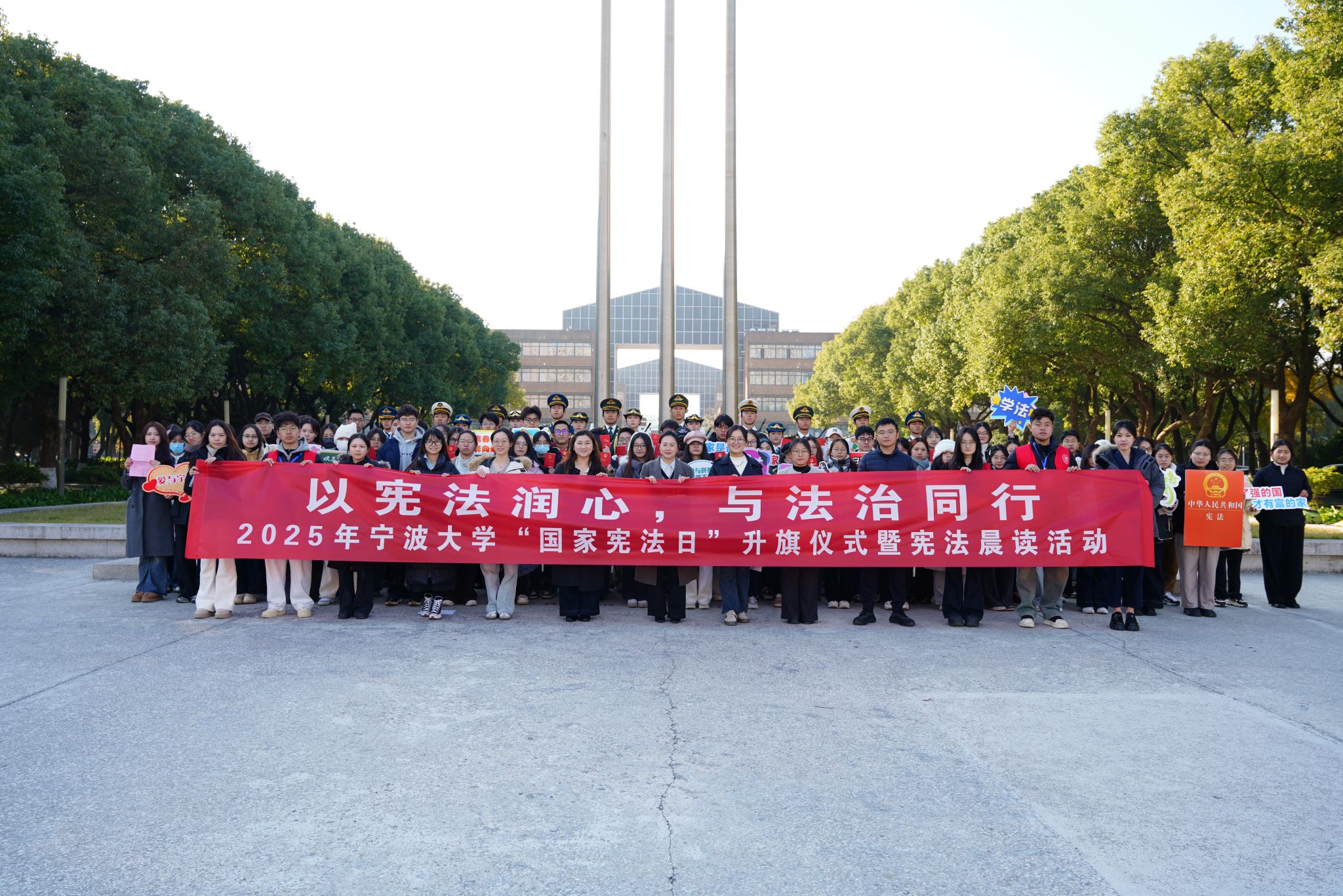 12月4日清晨,在我国第十二个“国家宪法日”到来之际,宁波大学“以宪法润心,与法治同行”主题升旗仪式暨宪法晨读活动在学校北大门国旗台前庄严举行。活动由法学院组织,法学院党委副书记谢果凰、学工办辅导员及80余名学生代表共同参与。