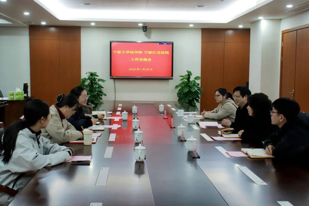 为深化法学教育与司法实践的融合,创新法治人才培养模式,1月28日,法学院党委书记孙芬娜、党委副书记谢果凰、学工办主任邓美玲及学生代表一行赴宁波市江北区人民法院开展专题合作交流。江北区人民法院党组书记、院长郑航捷,党组成员、副院长朱亚芸,党组成员、政治部主任胡馨,甬江法庭庭长周进军以及区委政法委王贤启等参加交流活动。双方围绕庭审进校园、合作平台共建、课题研究及实践教学协同等议题进行了深入探讨,旨在构建优势互补、协同发展的校地合作新格局。