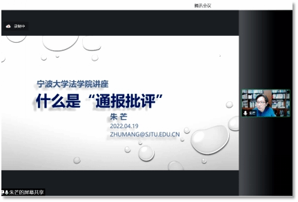 4月19日晚,宁波立法研究院法学名家讲坛第17讲暨宁大法苑讲坛2022年第6讲《什么是通报批评》讲座通过腾讯会议以线上方式展开。本次讲座由上海交通大学凯原法学院教授、博士生导师朱芒主讲,宁波大学法学院教授、院长梁开银主持,郑州大学法学院副教授郑磊、宁波大学法学院教授朱全宝、宁波大学法学院副教授夏雨参会与谈。来自各高校师生及实务界人士300余人参与聆听了本次讲座。