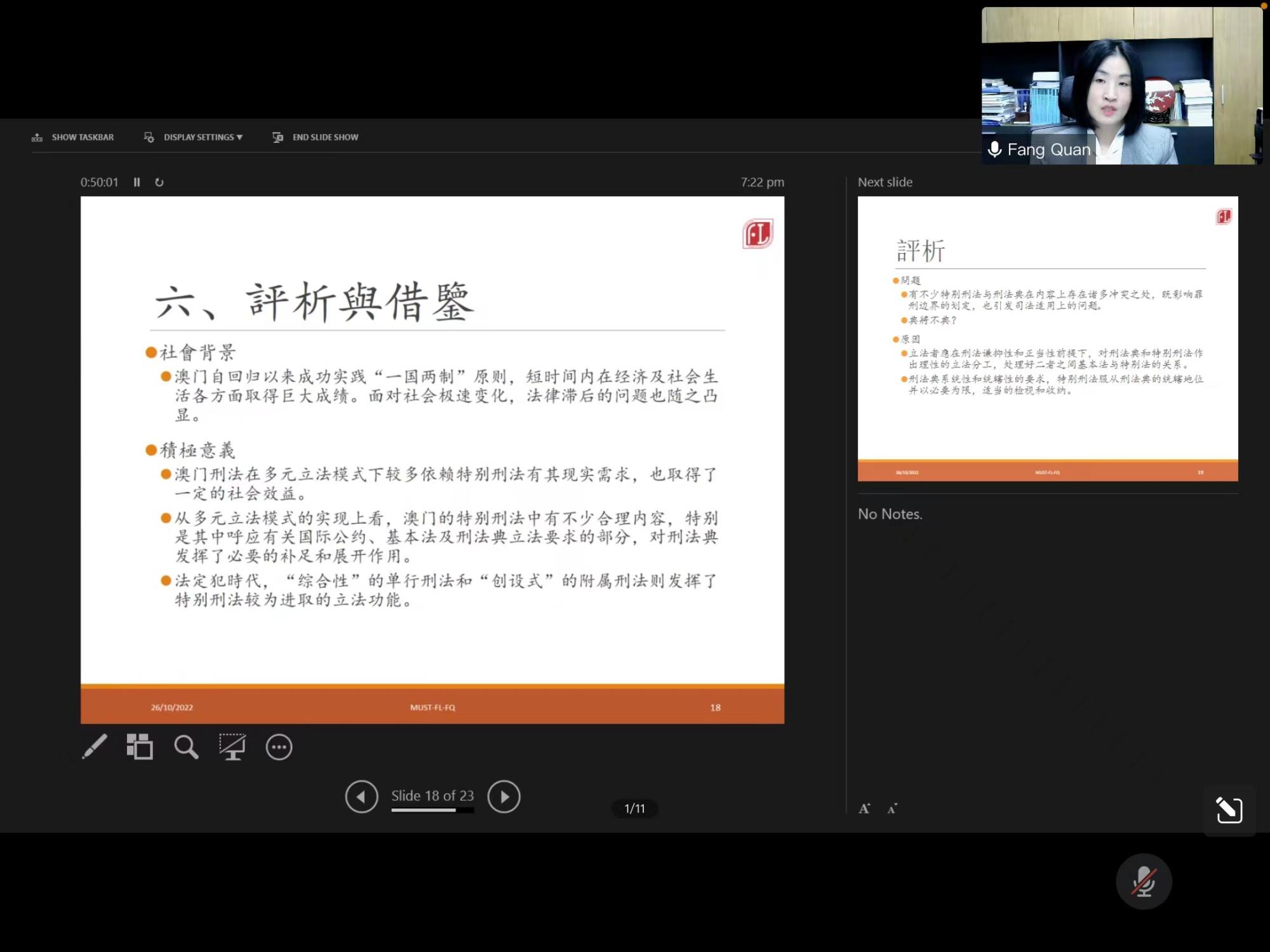 2022年10月26日,宁波大学法学院浙东法学讲坛第三讲由澳门科技大学法学院院长方泉教授主讲,她以“澳门刑法的本地化和现代化”为主题开展了一场两小时的精彩线上学术讲座。讲座由宁波大学法学院副院长何跃军教授主持,法学院张亚平教授与李娜教授进行了精彩与谈,法学院150余名师生参与讲座。