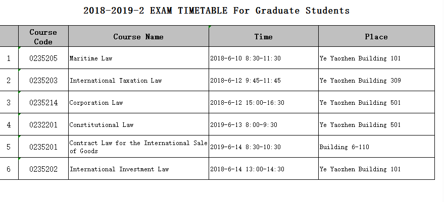 Here is the time table of the unified examinations. The examinations of other courses are arranged by the lecturer, and please confirm the examination time and place with the lecturer.