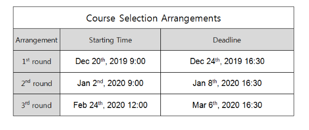 Course selection (1st round) will begin from Dec 20th, 2019 9:00 to Dec 24th, 2019 16:30. The second round goes from Jan 2nd, 2020 9:00 to Jan 8th, 2020 16:30. Please note that after Mar 6th, there is NO WAY to add or drop courses. If you don’t know anything about course selection, there is a meeting at 13:00 on Dec 27th in 11-202 explaining the course selection, teaching plan and other issues regarding teaching affairs. All students are required to come.